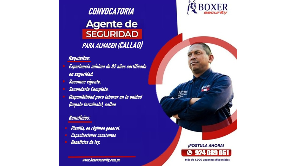 Bóxer Security, empresa líder en el rubro de seguridad con experiencia de 26 años entregando verdaderas soluciones con gran pulcritud y eficacia y con presencia a nivel nacional se encuentra en la búsqueda de AGENTES DE SEGURIDAD PARA CALLAO en almacén de minerales.