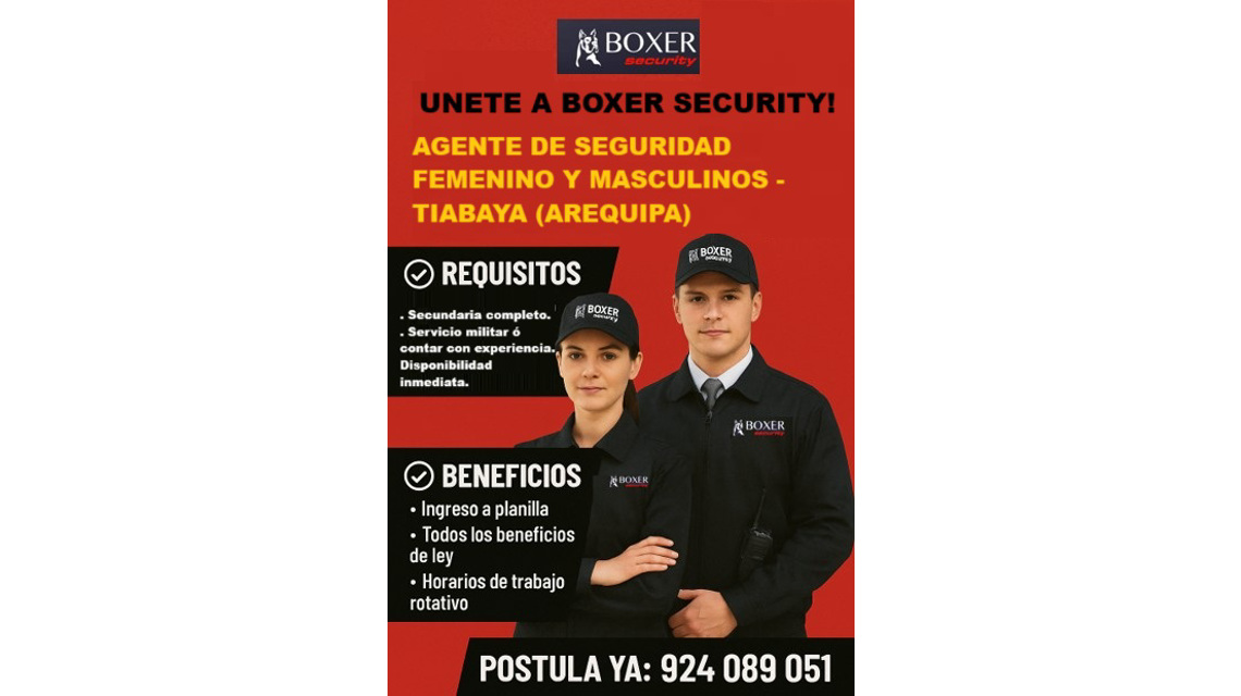 Contamos con presencia a nivel nacional, comprometidos con la protección y el bienestar de nuestros clientes. Nos encontramos en la búsqueda de un(a): AGENTE DE SEGURIDAD PARA TIABAYA